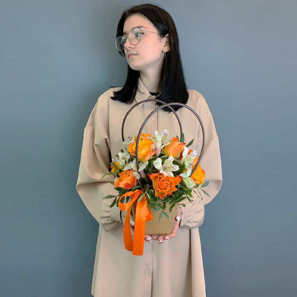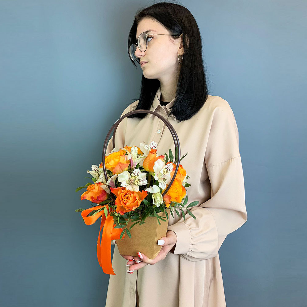 Коробка с розами "Заряд бодрости" оранжевый Кенийский микс №6991-Ор
