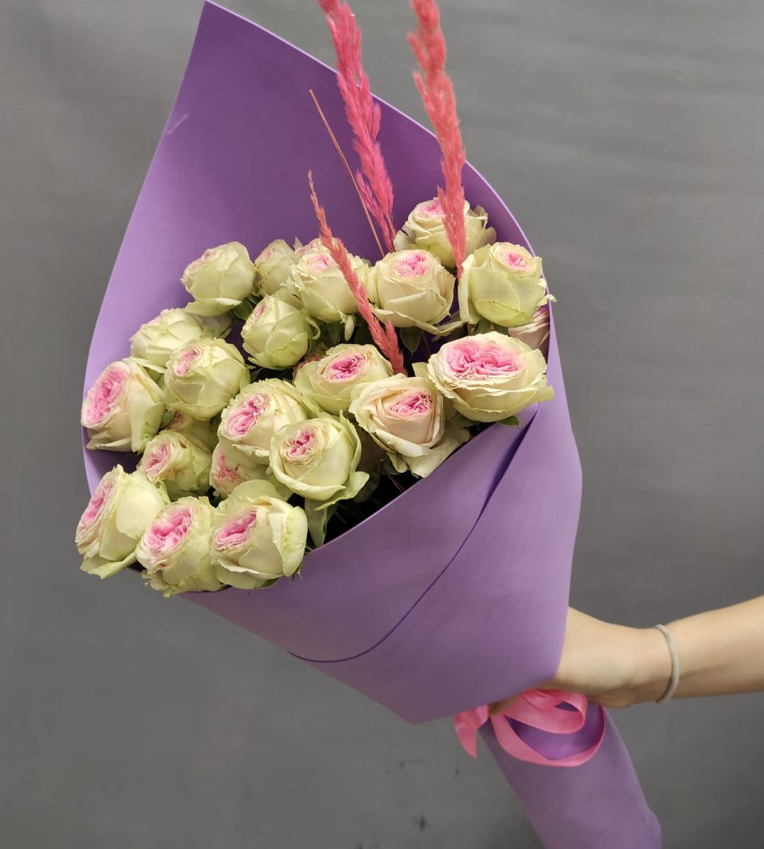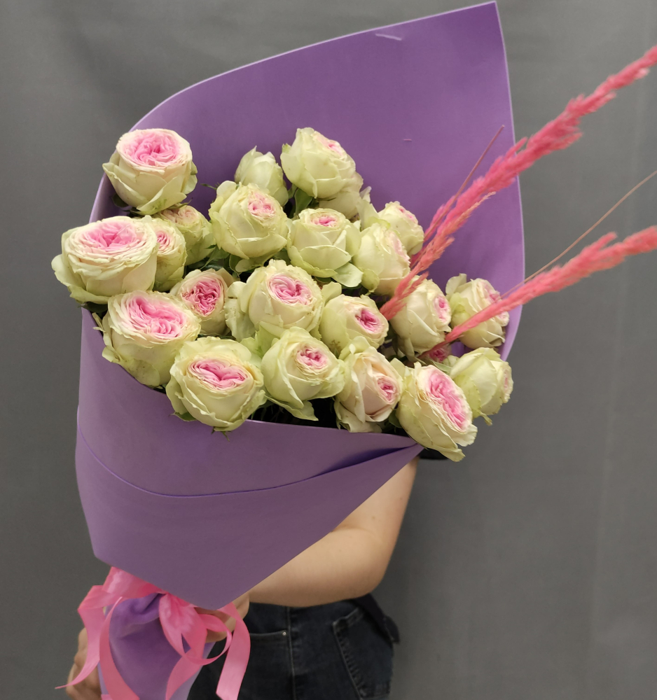 Букет из кустовых пионовидных роз бело-розового цвета арт. 47529