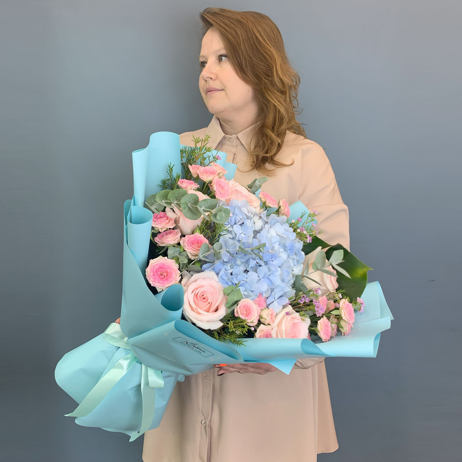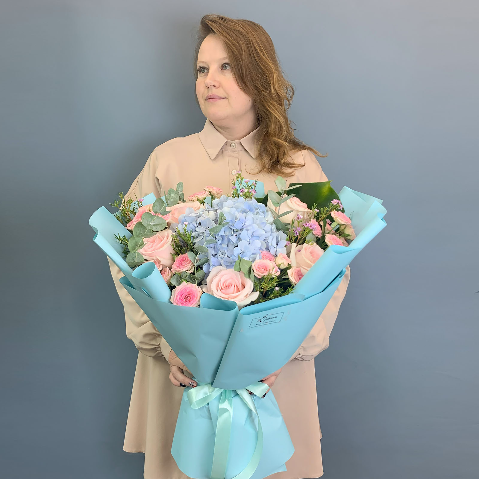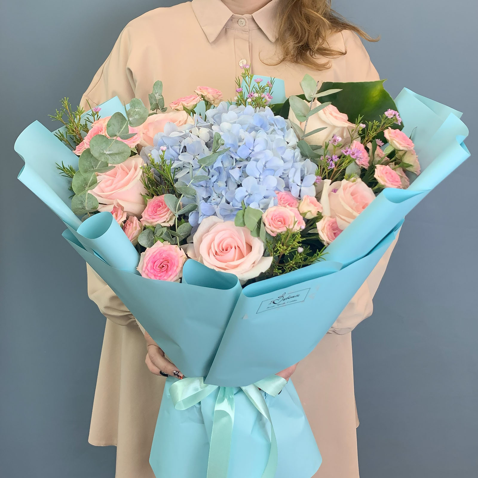 Букет с голубой гортензией и кустовыми розами арт. 71078