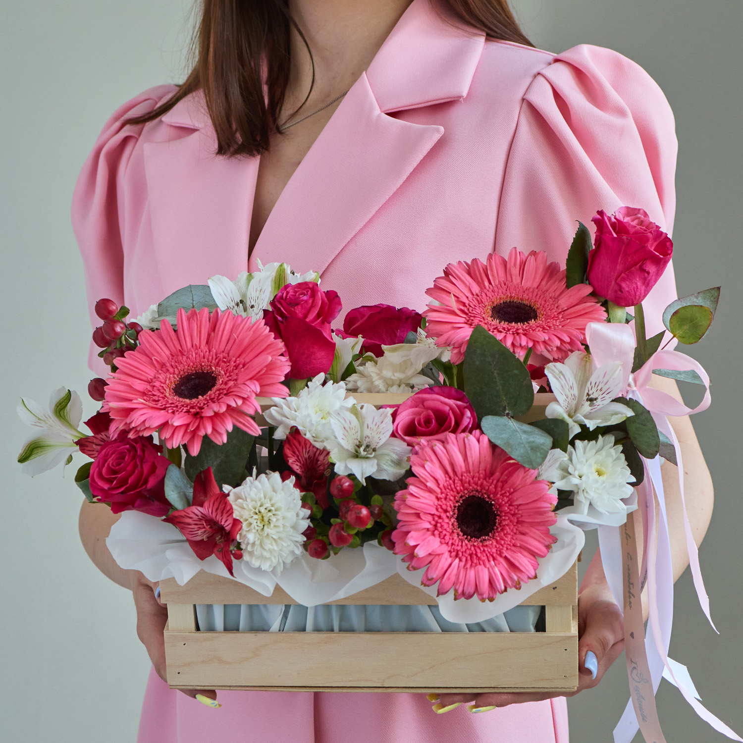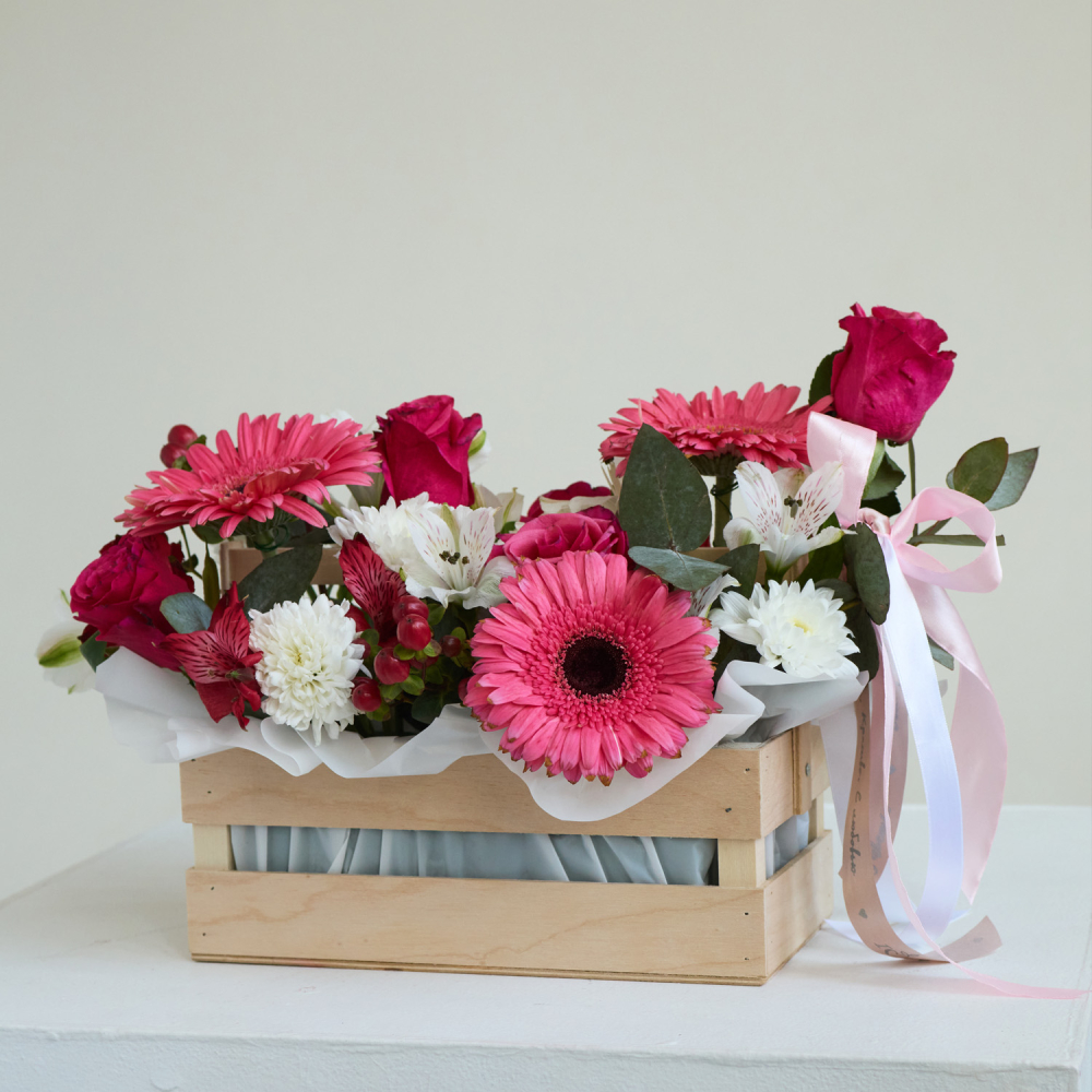 • Ящик с цветами "Свидание с ангелом" из роз и эустомы арт. 7753