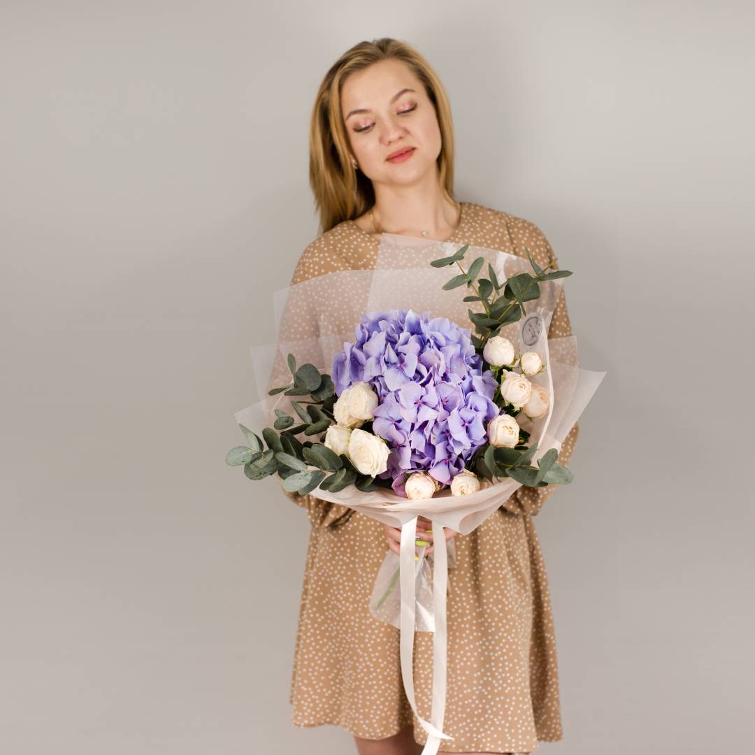 Букет из голубой гортензии и пионовидных роз с эвкалиптом арт. 50471