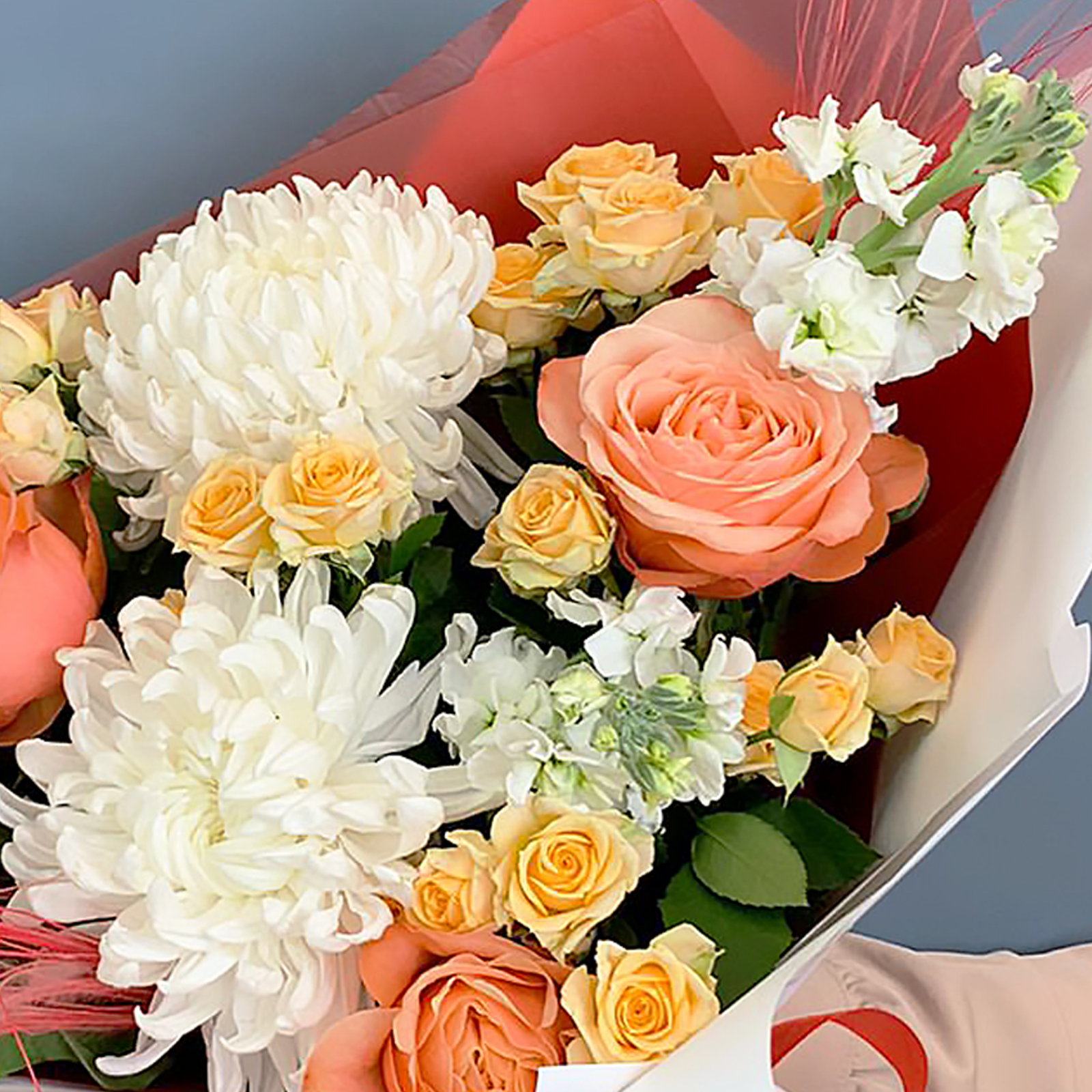 Букет из одноголовых хризантем с Эквадорскими розами и матиолой арт. 70981